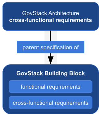 Every Building Block specification is an extension of the GovStack cross-functional requirements, much like a class extends a base class in object-oriented programming. The cross-functional requirements define the shared behaviour and constraints that all Building Blocks must satisfy - security, deployment, observability, data handling and so on. A Building Block specification inherits all of these rules and then adds its own functional requirements, API contracts and domain-specific logic on top. It can tighten or elaborate inherited rules where allowed, but it cannot contradict or weaken them.