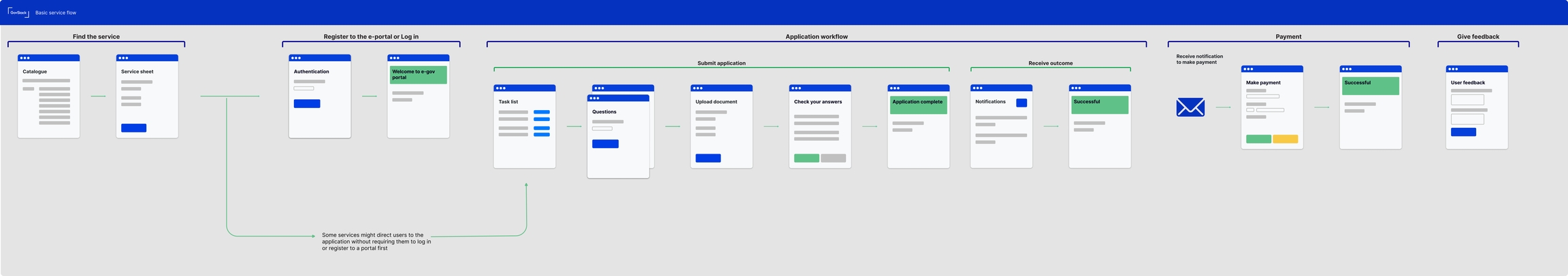 Find the service > Register or authenticate > Submit application (including answering questions and uploading documents) > Receive the outcome of a decision >