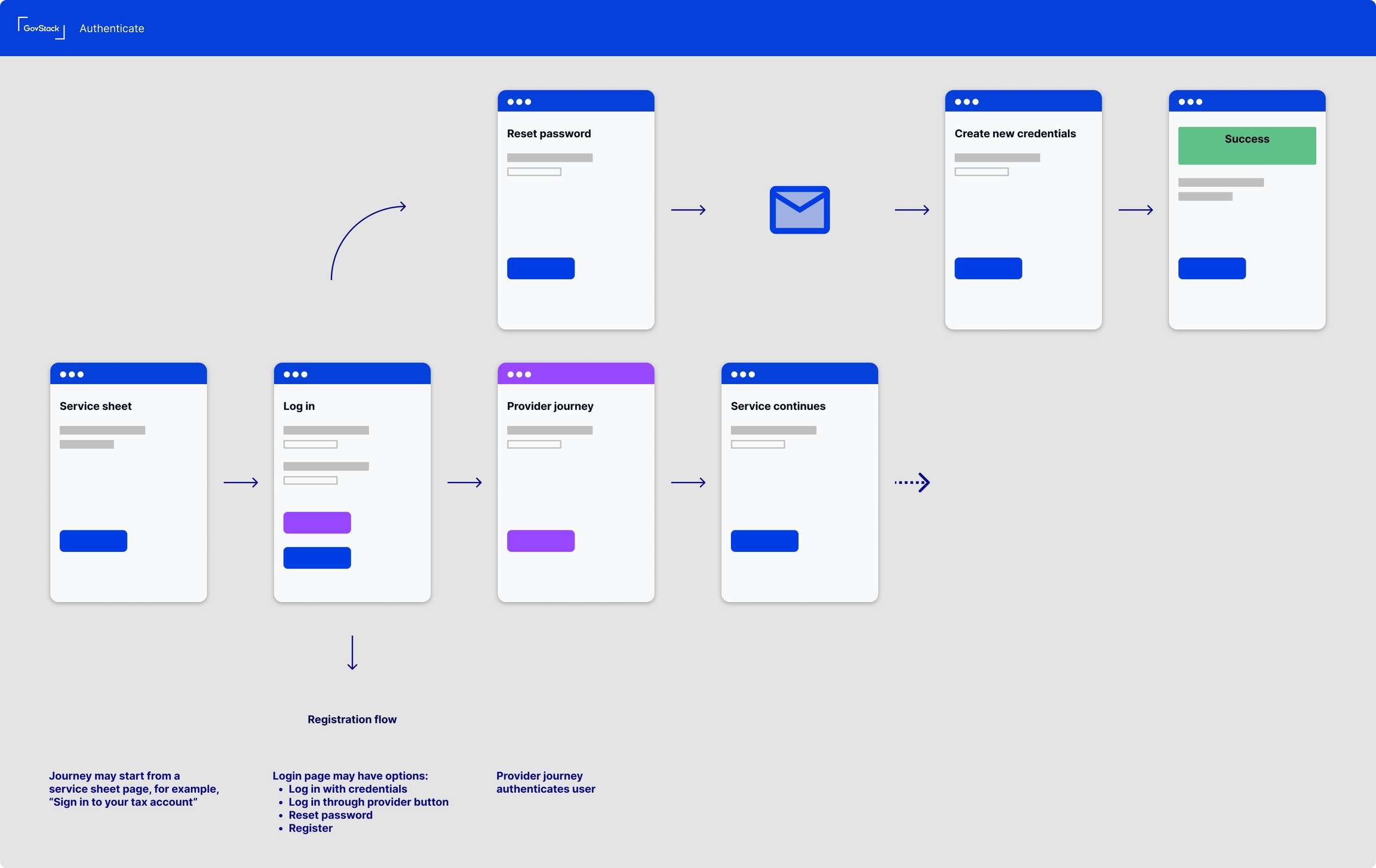 Login page > Provider journey > A: Service continues / B: Not authorised page