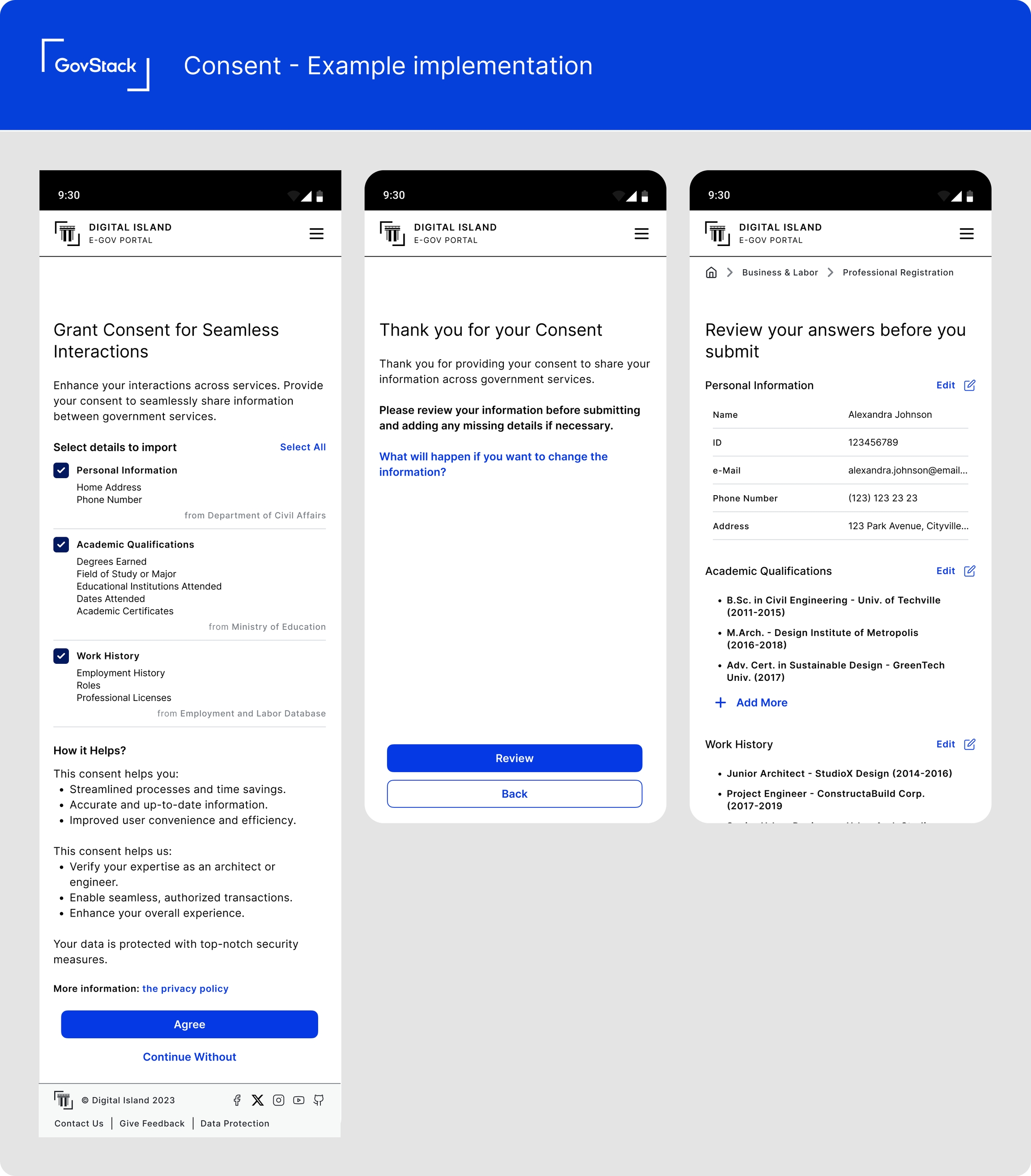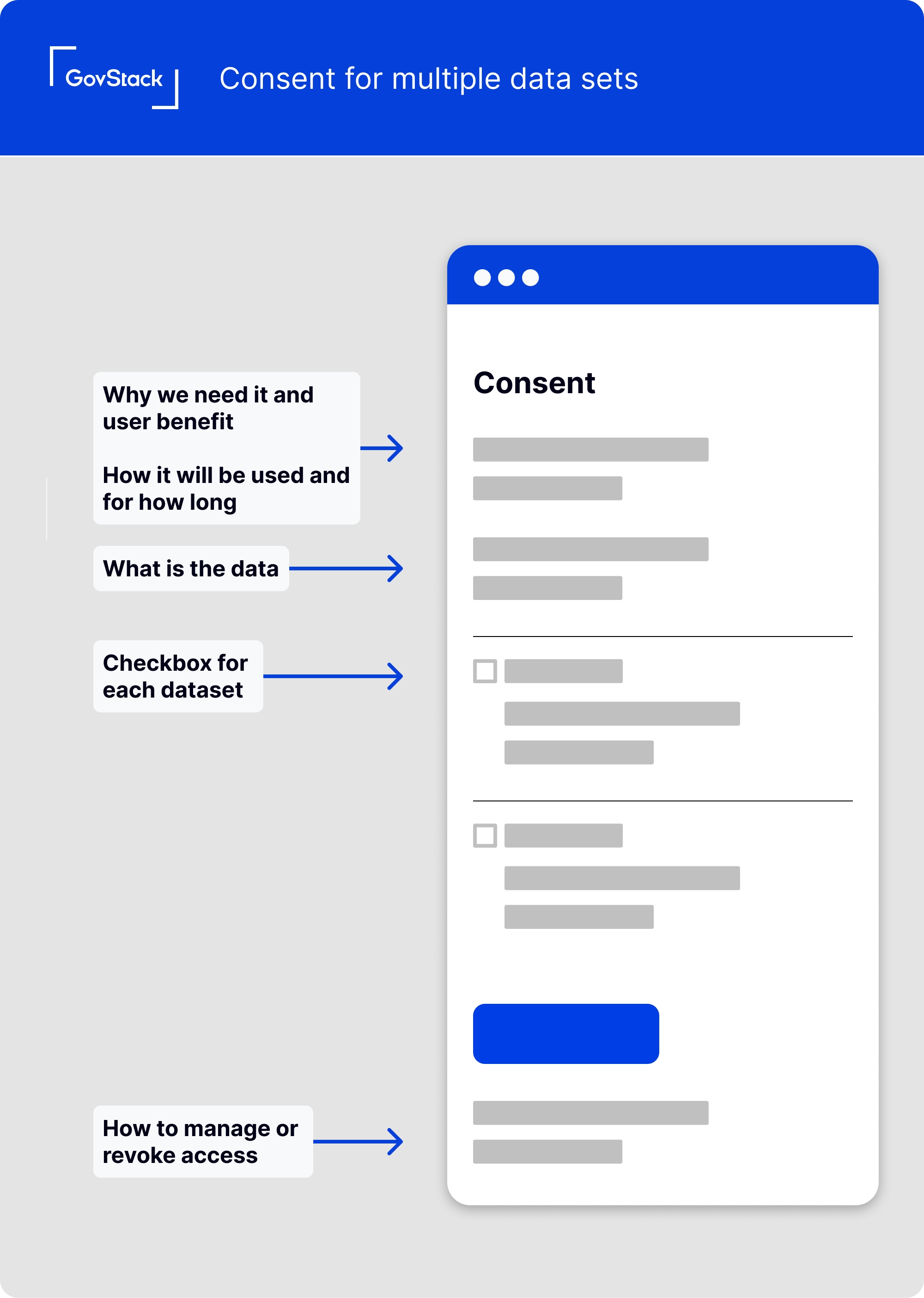 Use these patterns to give users control over how you manage their data. These patterns align with the GovStack Consent Building Block.