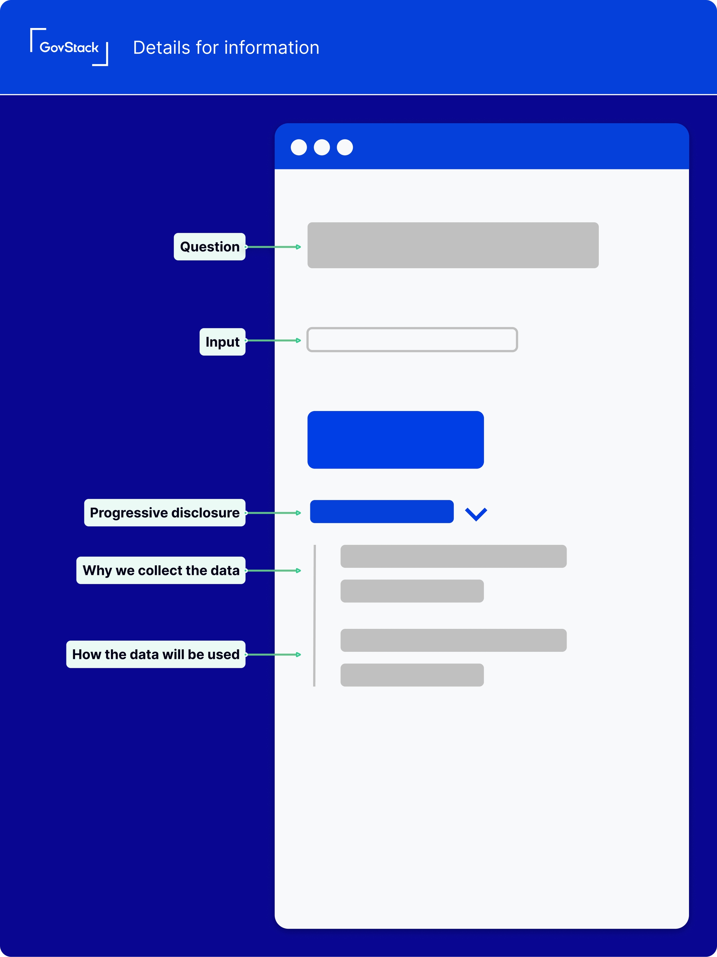 When asking users information during a questions flow consider using progressive disclosure drop-downs or inline content to explain why you are asking for that information and how you will handle the data.