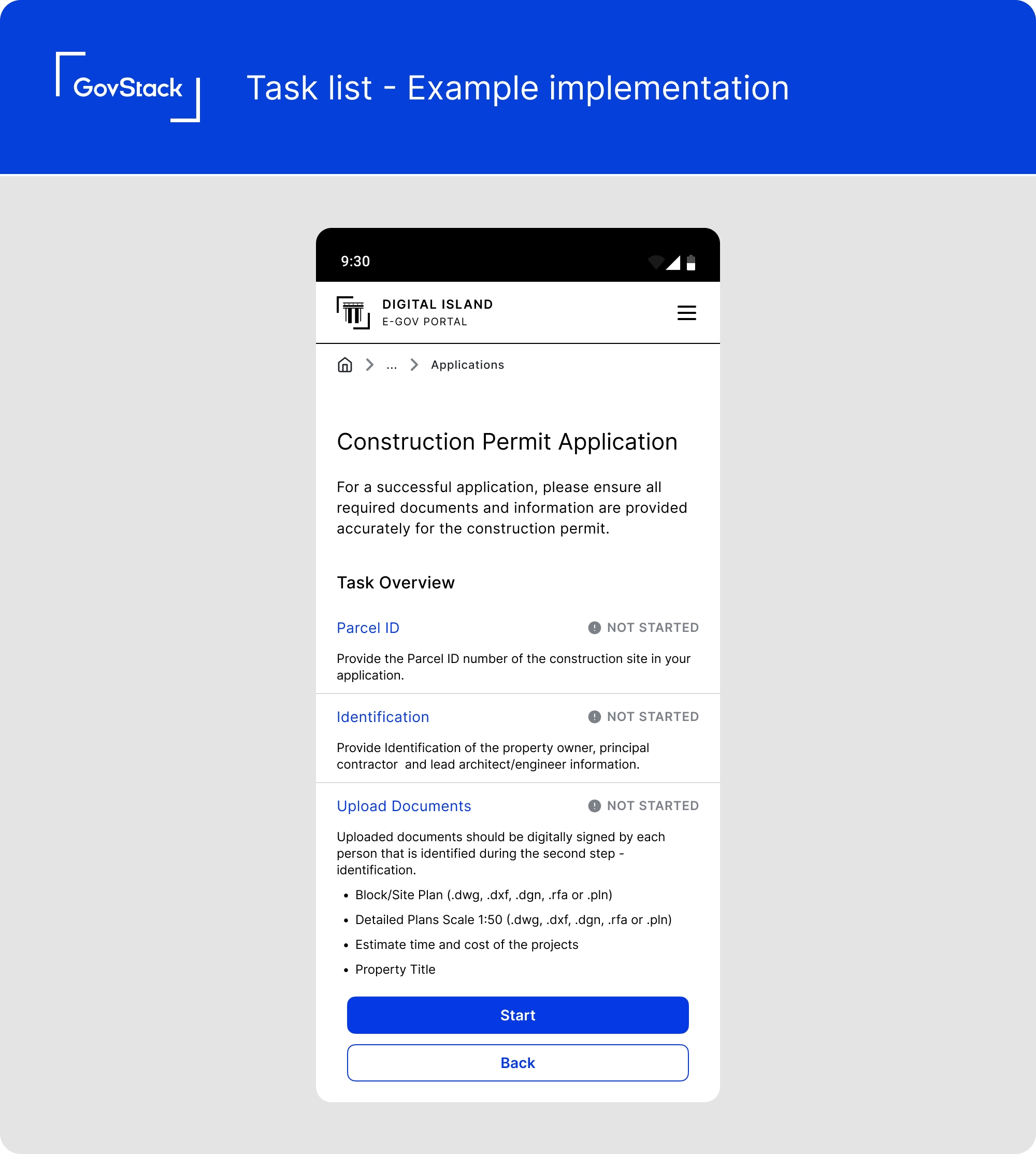 If the form or transaction is long, provide a save feature that allows users to pause and continue later. When users resume the transaction, display the task list page as the first thing they see.
