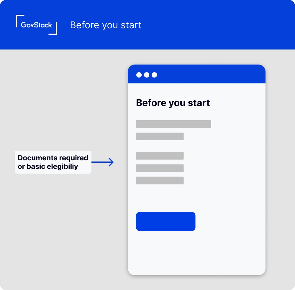 This page focuses the user's attention on what they need to complete the service in one go. You might list the documents or evidence required or emphasise certain eligibility criteria (e.g., age).