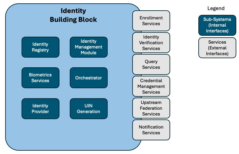The Identity Building Block creates, manages, and uses a digital foundational identity (functional identity is not in the scope of this document). As a part of the overall identity system, it can be interfaced with other Building Blocks in order to realize the complete set of requirements necessary for the delivering identification services and managing lifecycle of Foundational Identities.
