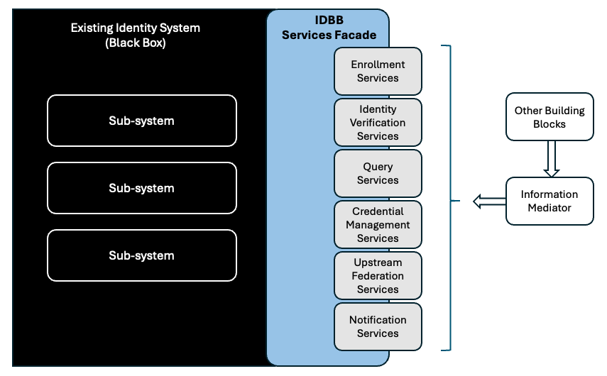 It happens that some countries have an existing identity system they choose to reuse, like for example a National Population Register, a Civil Register or ID Document system. In that case the existing system will need to be equipped with the ID BB Services Facade which will make its integration transparent toward the remainder of the GovStack.