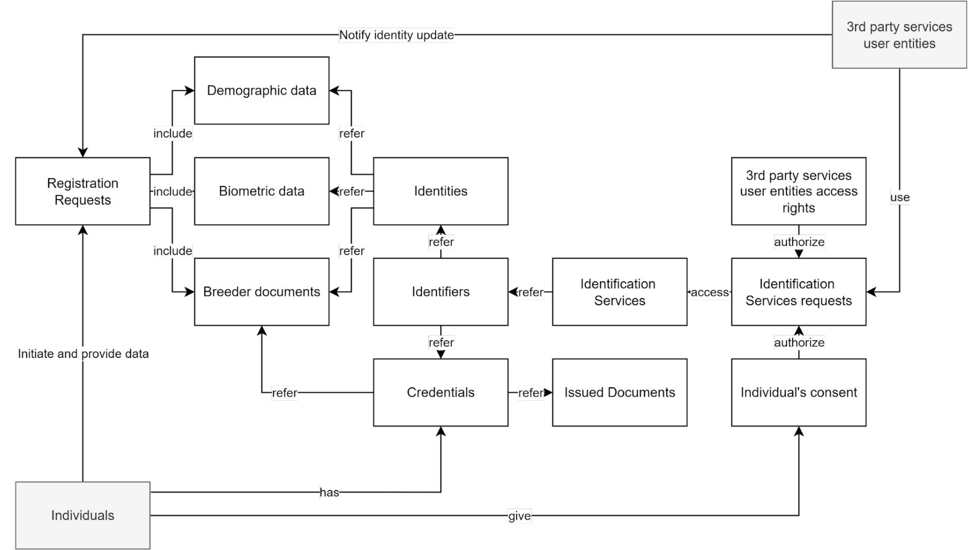 As identity data should be stored in different storage to ensure privacy protection allowing then data separation and data minimization principles, it’s necessary to use different identifiers for different types of data.