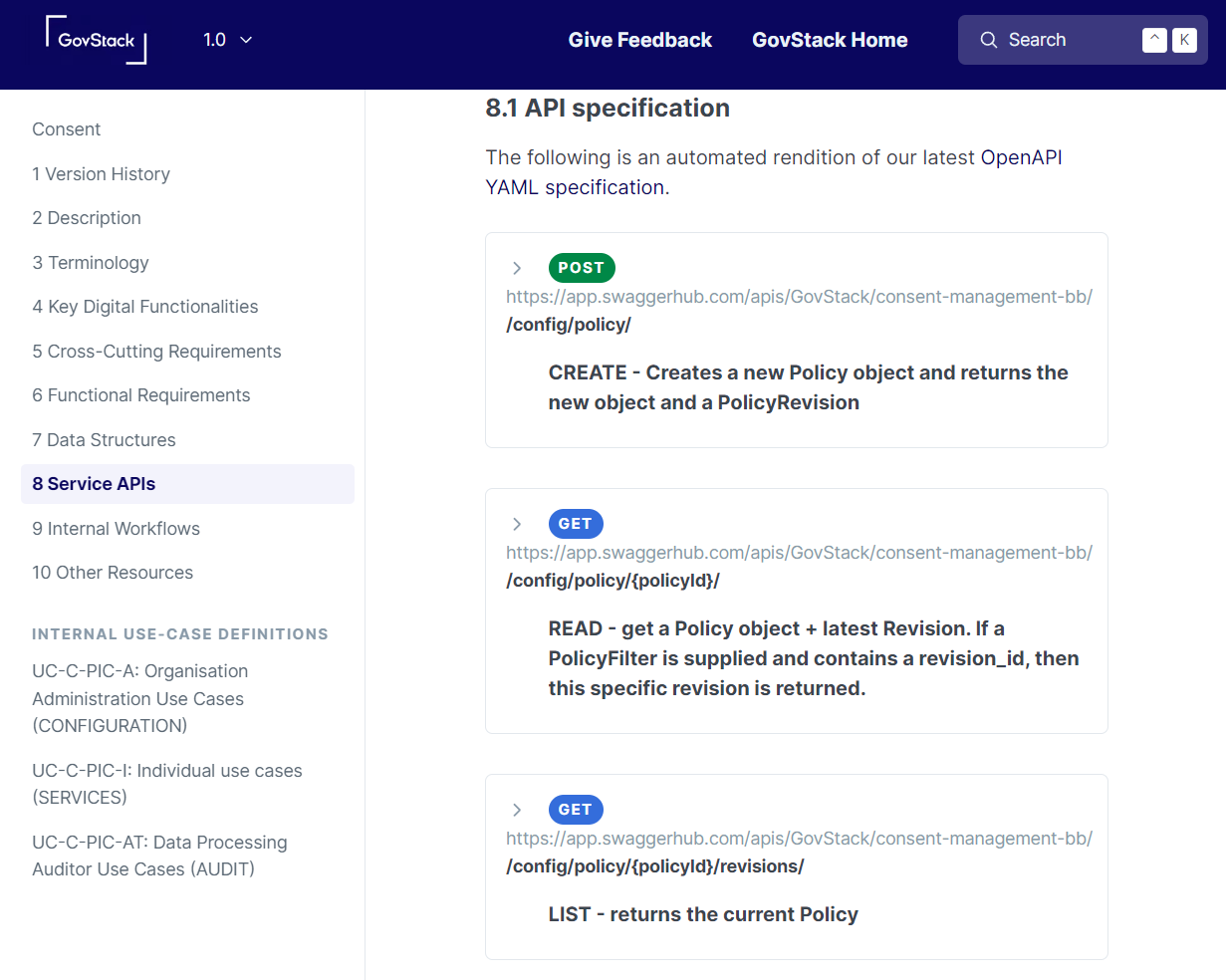 <figure><img src="https://content.gitbook.com/content/AjfvR3V09S9HmlHskZ6N/blobs/Ylvq5JOZGVwlx5XLm9Va/Screenshot%202023-10-31%20191233.png" alt=""><figcaption><p>GovStack technical specifications for Consnet Bulding Block</p></figcaption></figure>