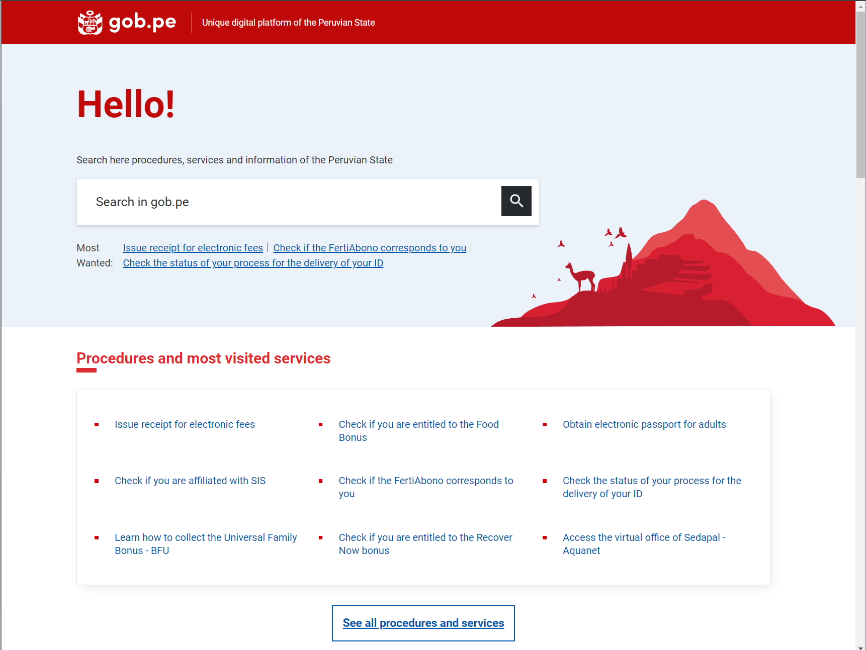 Landing page of gob.pe that presents the most demanded services.