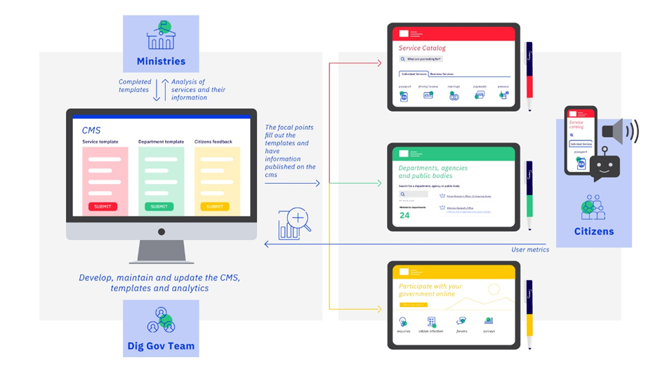 A government digital service catalog is an online platform or database that provides information about various digital services and resources offered by a government to its citizens, businesses, and other stakeholders. The service catalog can be made available to users with a consistent/unified user experience.