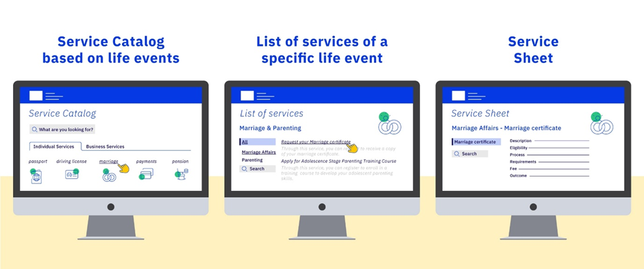 Service catalog, with services mapped to citizen/business life events.