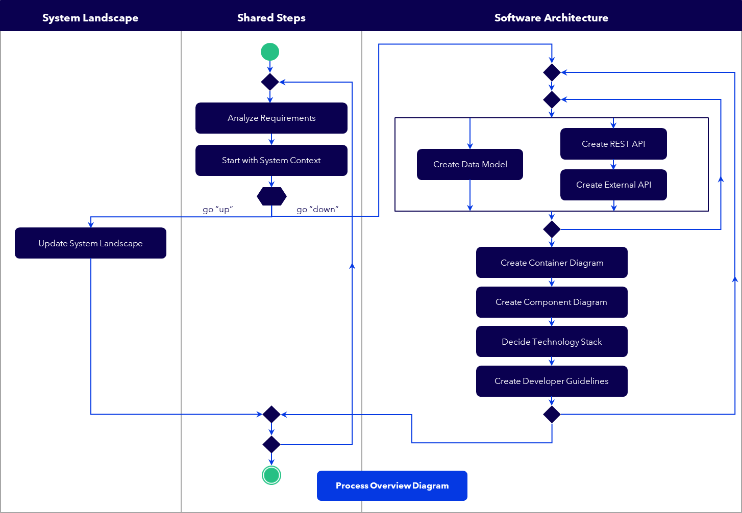 System Architecture and System Landscape provide different perspectives and different levels of detail of looking at an architecture. In the following process, the steps 1, 2 and - A.1 describe the creation or update of a System Landscape, while the steps 1,2 and B.1-B.7 need to be performed when creating the System Architecture.