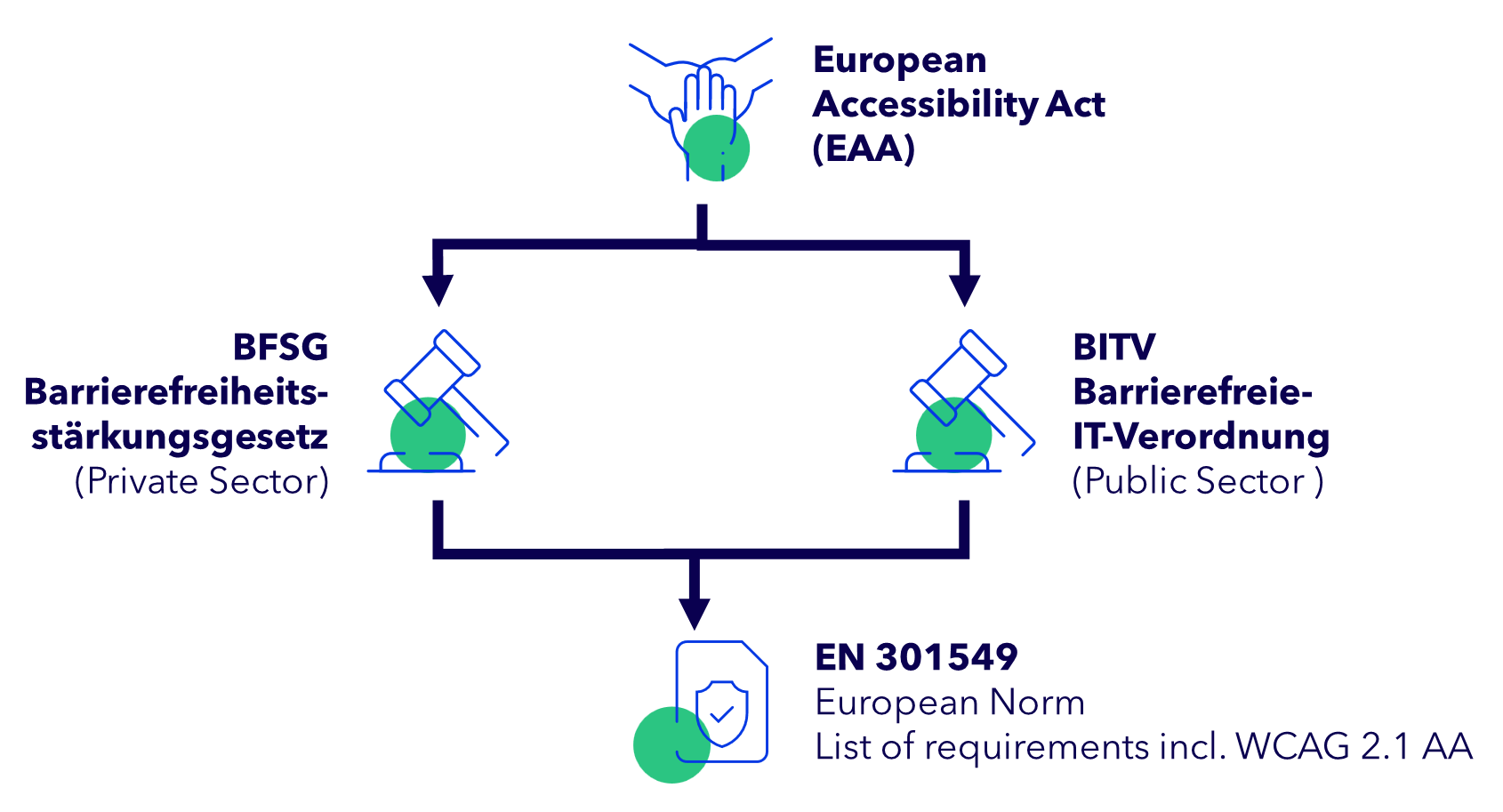 * [**European Accessibility Act:**](https://commission.europa.eu/strategy-and-policy/policies/justice-and-fundamental-rights/disability/union-equality-strategy-rights-persons-disabilities-2021-2030/european-accessibility-act_en) Law that requires companies as well as public sector bodies to provide digital products and services including websites, apps, online shops, and banking services in an accessible format to ensure equal access for individuals with disabilities *(European Accessibility Act, 2025)*. For example, the graph below illustrates how the EAA in Germany is divided into BFSG for private companies and BITV for public sector bodies.