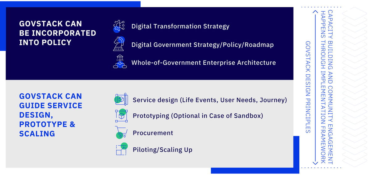 The GovStack implementation framework considers incorporating a BB approach at the level of digital institutional governance, ICT policy & citizen-centric co-design & delivery of government digital services.