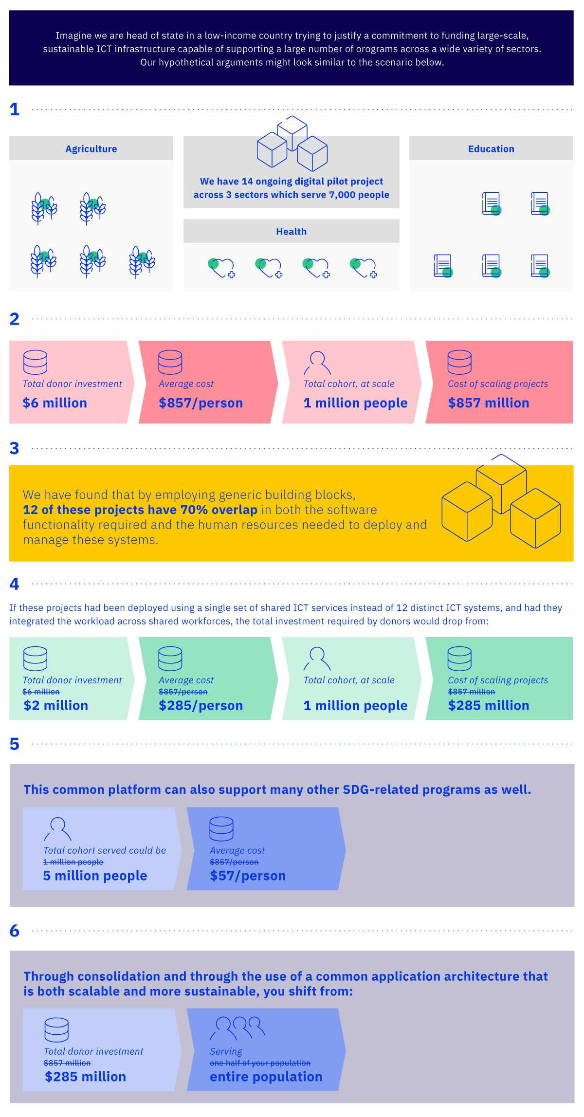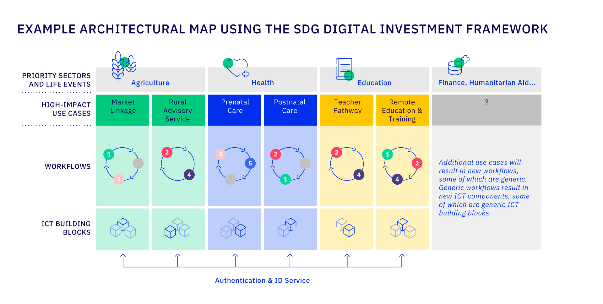 Common ICT Building Blocks enable generic business processes, or WorkFlows, that can be combined and repurposed in multiple ways to deliver priority Use Cases that contribute to SDG Targets. National governments can prioritize Use Cases according to citizens’ needs (e.g. improve neonatal outcomes), map functionality across sectors, and then invest in shared infrastructure comprising ICT Building Blocks.