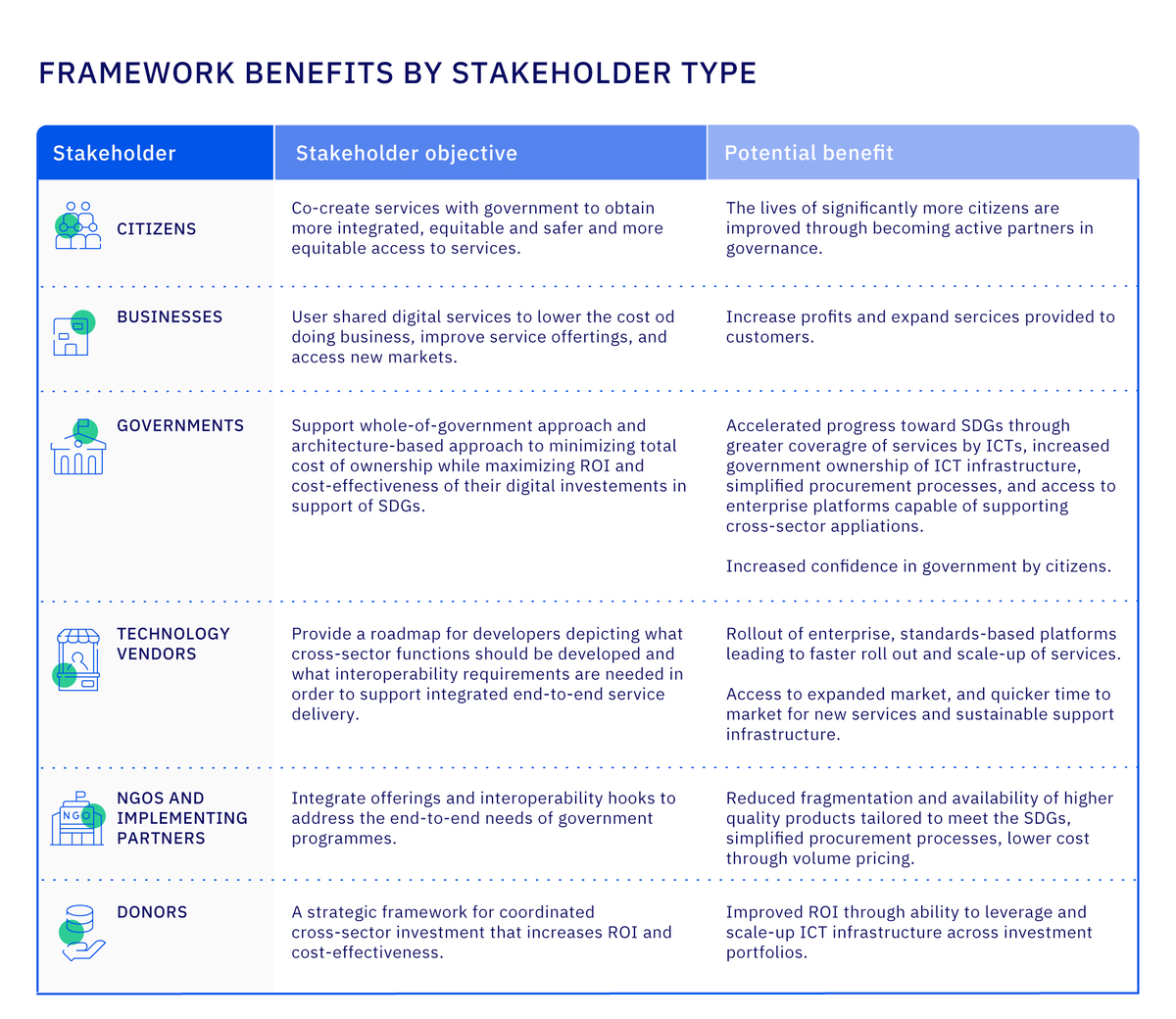 A whole-of-government approach to digital investment to help achieve the SDGs stands to benefit the entire value chain: citizens, businesses, governments, and their partners, and the supporting ecosystem of ICT developers and implementers.