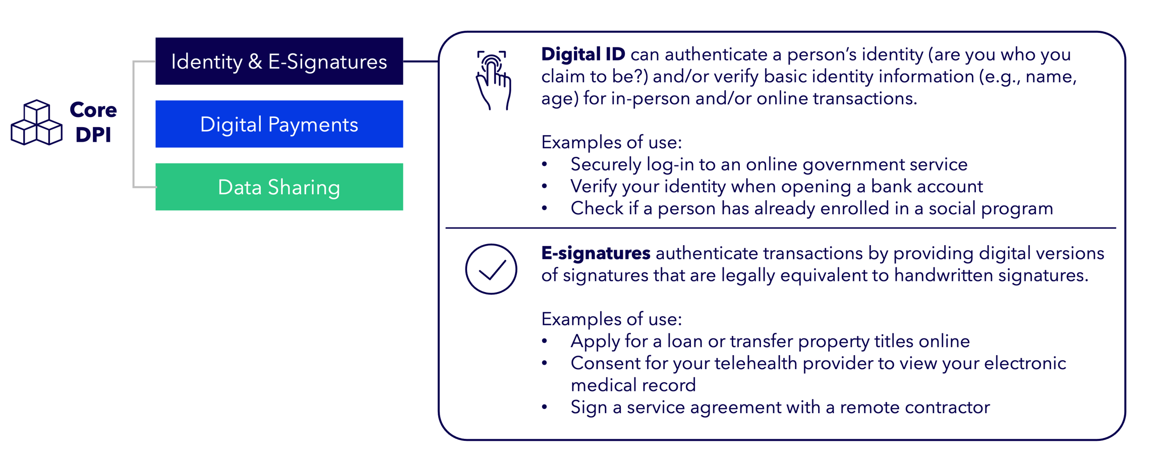 Digital identity: Allows both individuals and organizations to uniquely identify and authenticate themselves online, which includes digital IDs, e-signatures, as well as civil registration systems.