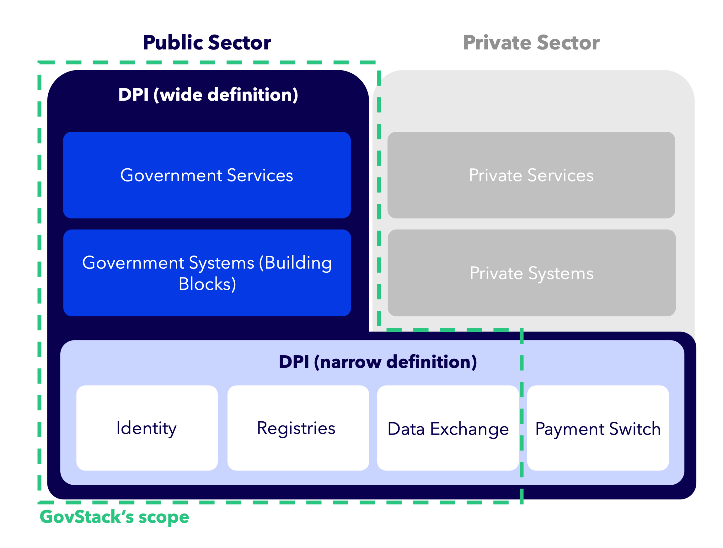 GovStack’s technical specifications support the practical implementation of DPI, recognising that DPI may be defined narrowly as foundational service-enabling systems (e.g. identity and data exchange) or more broadly include the government systems and digital services that build on these foundations. GovStack’s specifications describe implementations of DPI which are A) owned (or strictly regulated) by the public sector and B) used by the public sector or those shared between the public and private sectors. They do not define any components used exclusively by the private sector.