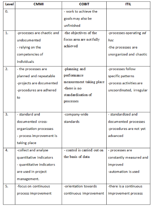 The CMMI and ITIL frameworks use a 5-point maturity scale, and COBIT adds another step to the scale, also describing the 0-level in the model. A summary of the maturity scale of the frameworks examined and the keywords corresponding to the maturity levels is given in the Table below: