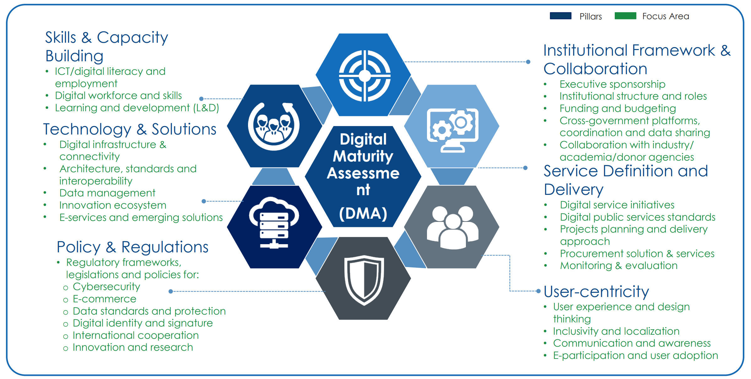 The UNDP Digital Maturity Assessment can be used to evaluate the current potential for digital government across six key pillars that include: Technology and Solutions, Policy and Regulations, Skills and Capacity Building, User Centricity, Service Definition and Delivery, Institutional Framework, and Collaboration.