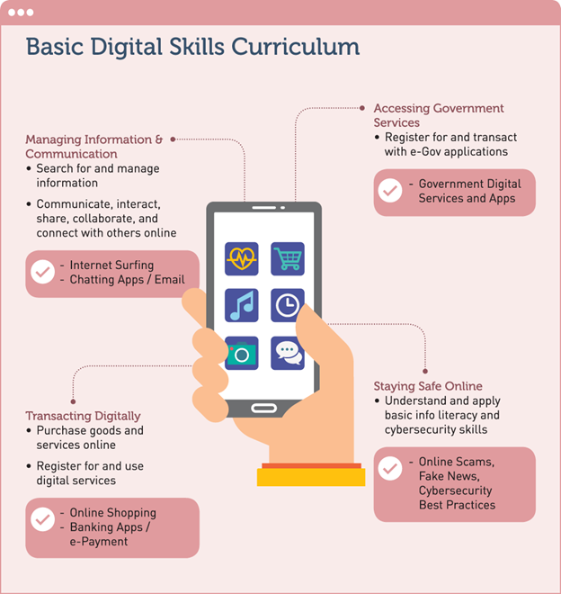 The Ministry of Communications and Information (MCI), Government of Singapore has a set of portfolios to drive the digital transformation. One such is “Digital Readiness” with four strategic outcomes (a) Digital access (b) Digital Literacy (c) Digital participation and (d) Digital inclusion by design. In regard to “Digital Literacy”, the “Digital Readiness (MCI n.d.)" blueprint recommends the following.