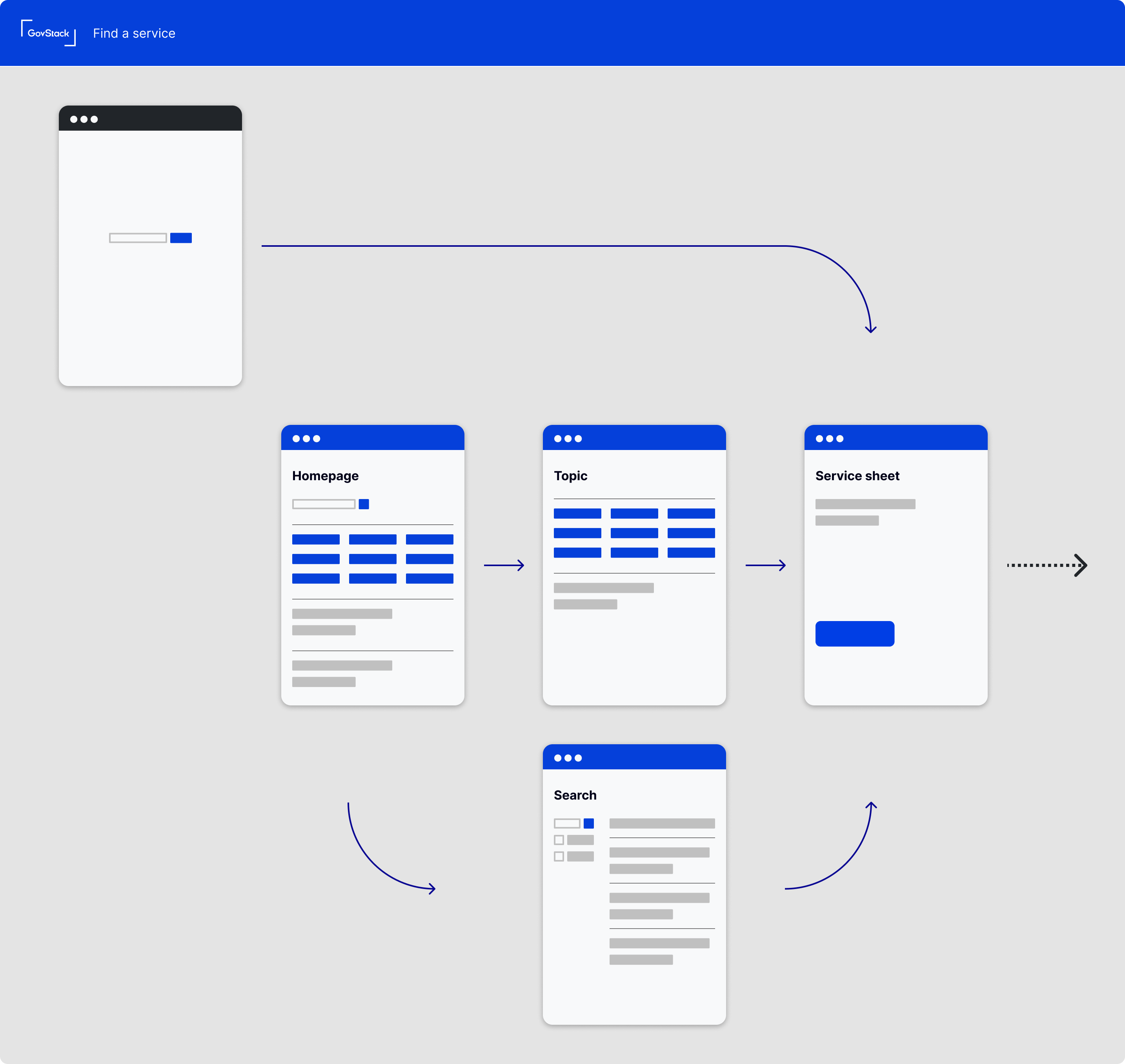 <table data-header-hidden><thead><tr><th width="131"></th><th></th></tr></thead><tbody><tr><td><strong>Steps</strong></td><td><p><strong>Find through taxonomy</strong></p><p>Service catalogue/homepage > Topic page > Service sheet > Service</p><p><strong>Search for service</strong></p><p>Service catalogue/homepage > Results page > Service sheet > Service<br><br><strong>Through search engine</strong></p><p>Search engine > Service sheet > Service</p></td></tr><tr><td><strong>Patterns</strong></td><td>Service catalogue<br><a href="../6-page-templates/7.9-service-sheet">Service sheet<br></a>Search results</td></tr></tbody></table>
