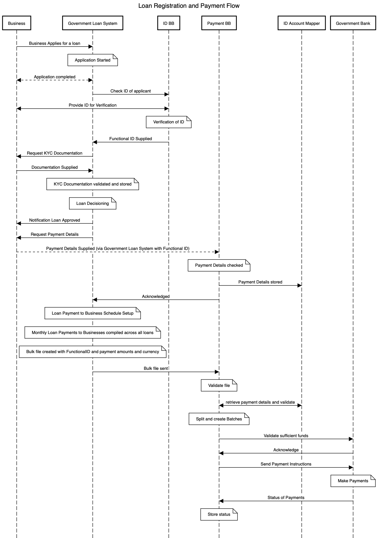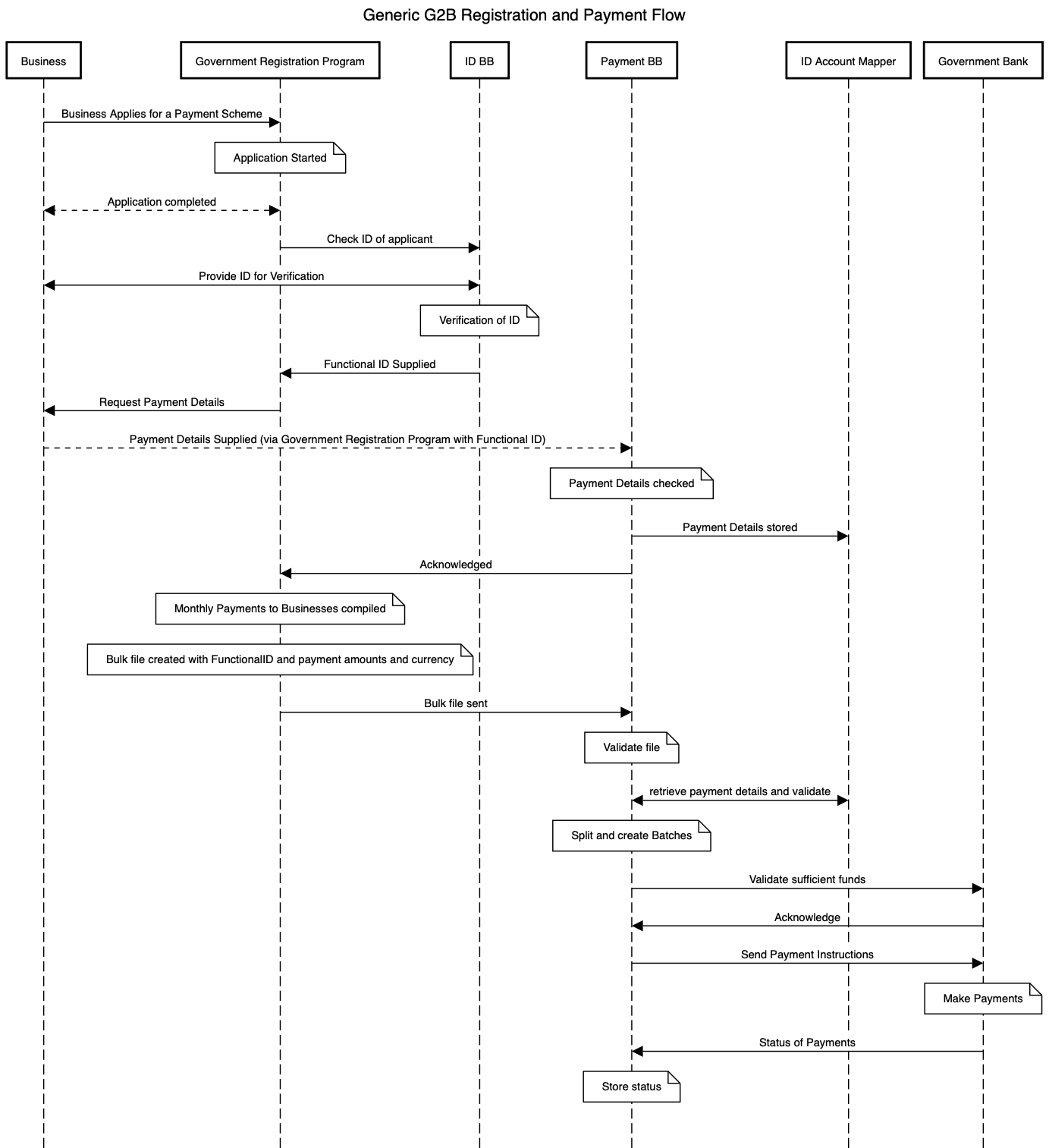 The following diagram shows a happy path generic workflow for Registration and Payments for a G2B scheme:
