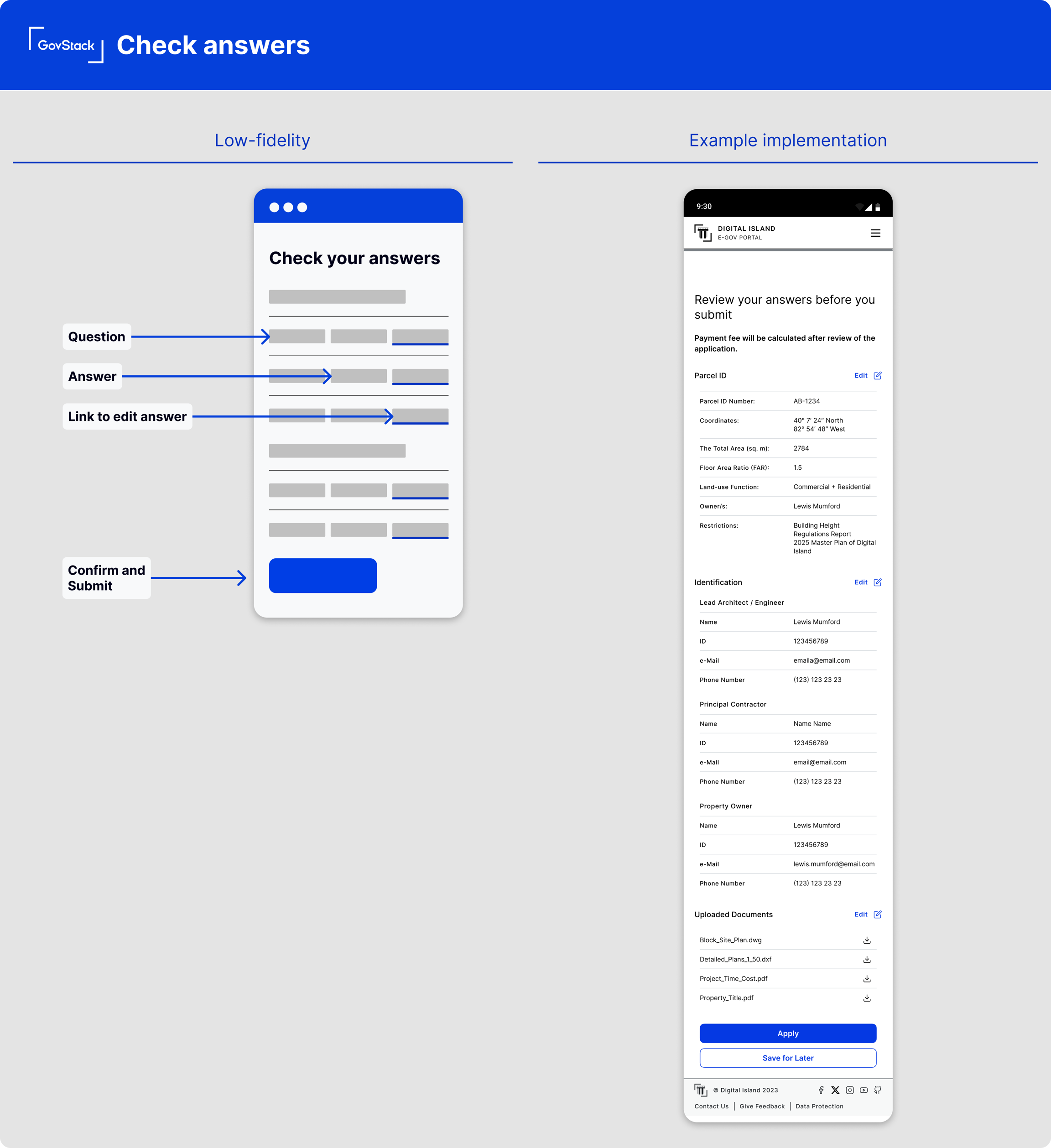 Use this pattern when information is collected across multiple pages or steps and users need to confirm accuracy before submission.